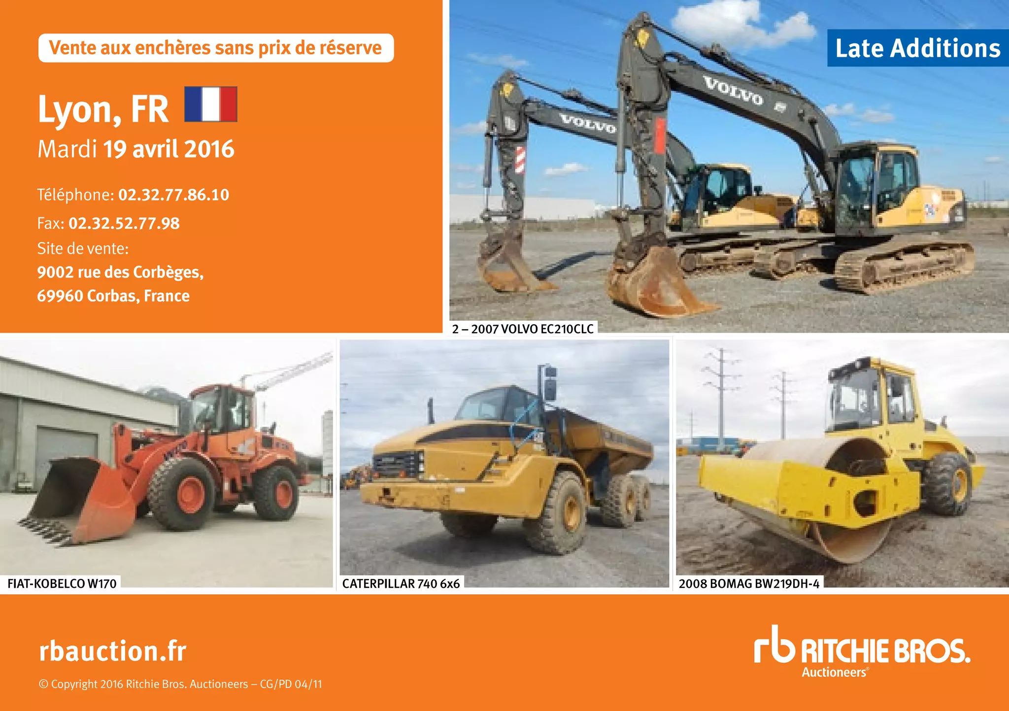 Le document présente une liste de matériels lourds et véhicules disponibles à la vente aux enchères organisée par Ritchie Bros. Auctioneers, avec des ajouts quotidiens. Il inclut des marques variées comme Volvo, Caterpillar et Renault, ainsi que des informations de contact pour les acheteurs et vendeurs intéressés. Pour consulter la liste actualisée des équipements, il est recommandé de visiter le site rbauction.fr.
