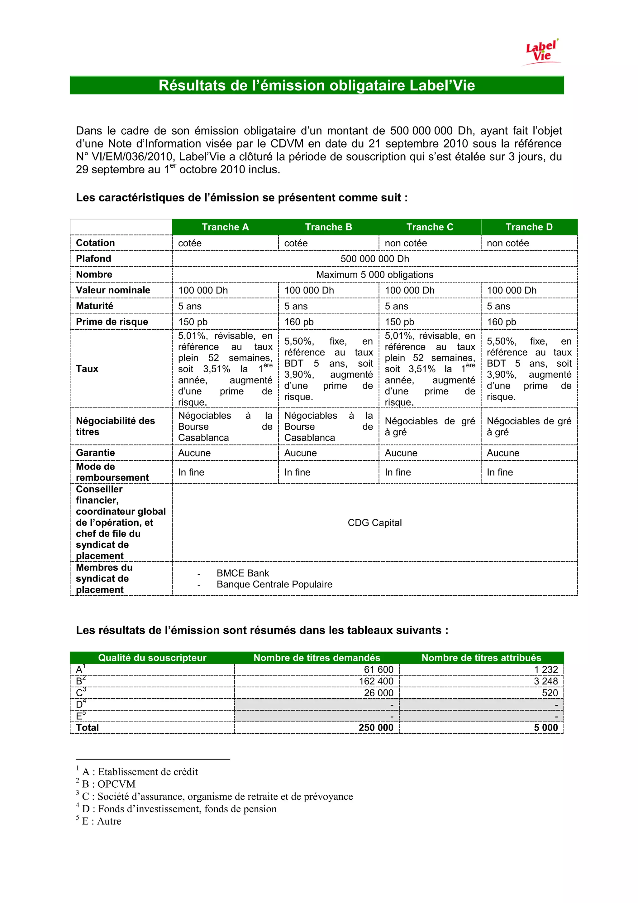 L'émission obligataire de Label’Vie, d'un montant de 500 millions de dirhams, a eu lieu du 29 septembre au 1er octobre 2010 et a été sursouscrite 50 fois avec un taux d'allocation de 2,00%. Les caractéristiques de l'émission incluent quatre tranches avec différentes conditions de taux et maturité, et la période de souscription a attiré divers souscripteurs tels que des établissements de crédit et des sociétés d'assurance. Les résultats montrent un total de 250 000 titres demandés et 5 000 titres attribués.
