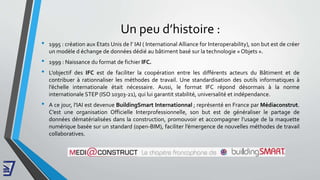 Le document retrace l'historique et le développement du BIM (Building Information Modeling), introduit le format IFC pour améliorer la collaboration dans le secteur du bâtiment, et décrit les niveaux de maturité du BIM allant du niveau 0 à 3, ainsi que ses bénéfices en termes de réduction des erreurs et d'optimisation des coûts. Le BIM favorise une conception collaborative, mettant en avant l'importance de la maquette numérique tout au long du cycle de vie du bâtiment. Des initiatives gouvernementales en France encouragent l'adoption du BIM pour les projets publics, préfigurant son intégration croissante dans l'industrie de la construction.
