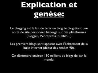 Le document traite de l'évolution du blogging en Algérie, soulignant que le pays comptabilise environ 5000 blogs, avec une majorité en français et une croissance notable des blogs en arabe. Les thématiques abordées incluent la technologie, la musique, l'éducation et le sport, tandis que des entreprises commencent à s'impliquer à travers des blogs professionnels. Le futur de la blogosphère semble orienté vers la diversification et la monétisation, avec un nombre croissant de blogueurs professionnels.