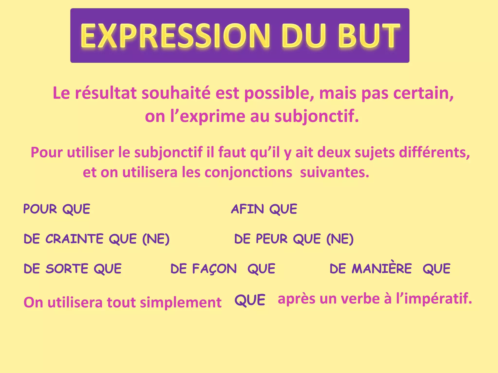 Le subjonctif est utilisé pour exprimer des résultats souhaités mais incertains, nécessitant deux sujets. Différentes conjonctions et prépositions sont employées pour introduire des clauses au subjonctif ou à l'infinitif selon la relation des sujets. Des exemples illustrent l'utilisation correcte de ces structures dans des phrases variées.