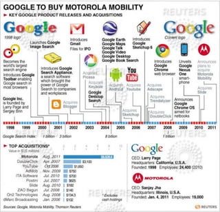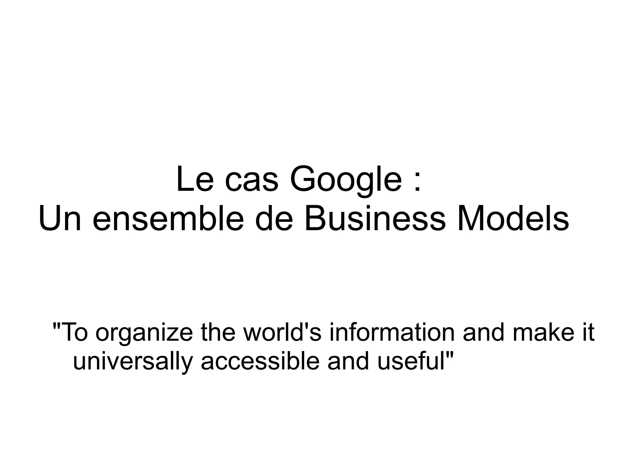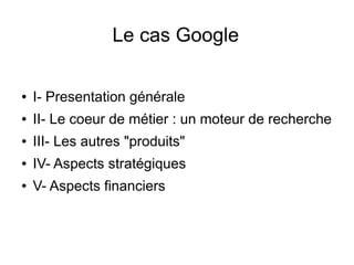Le document présente le développement de Google, de ses débuts comme un moteur de recherche à son modèle économique basé sur la publicité en ligne, illustrant son succès à travers des acquisitions stratégiques et une innovation constante. En 2001, Google est devenu le leader du marché des moteurs de recherche, générant 90% de ses revenus grâce aux annonces publicitaires. Le document aborde également les défis concurrentiels, les risques associés à son monopole sur la publicité en ligne et les prévisions de croissance du marché.