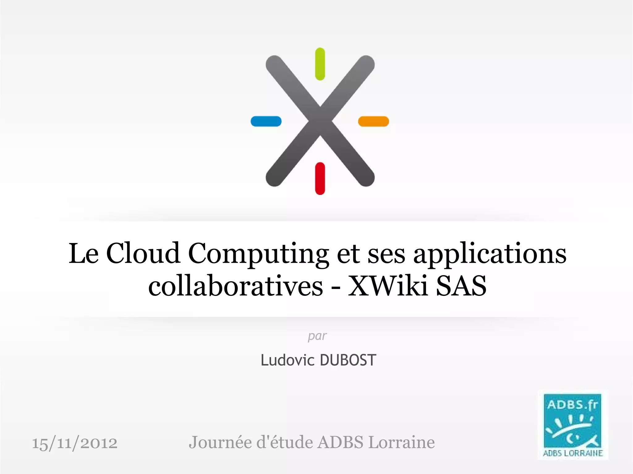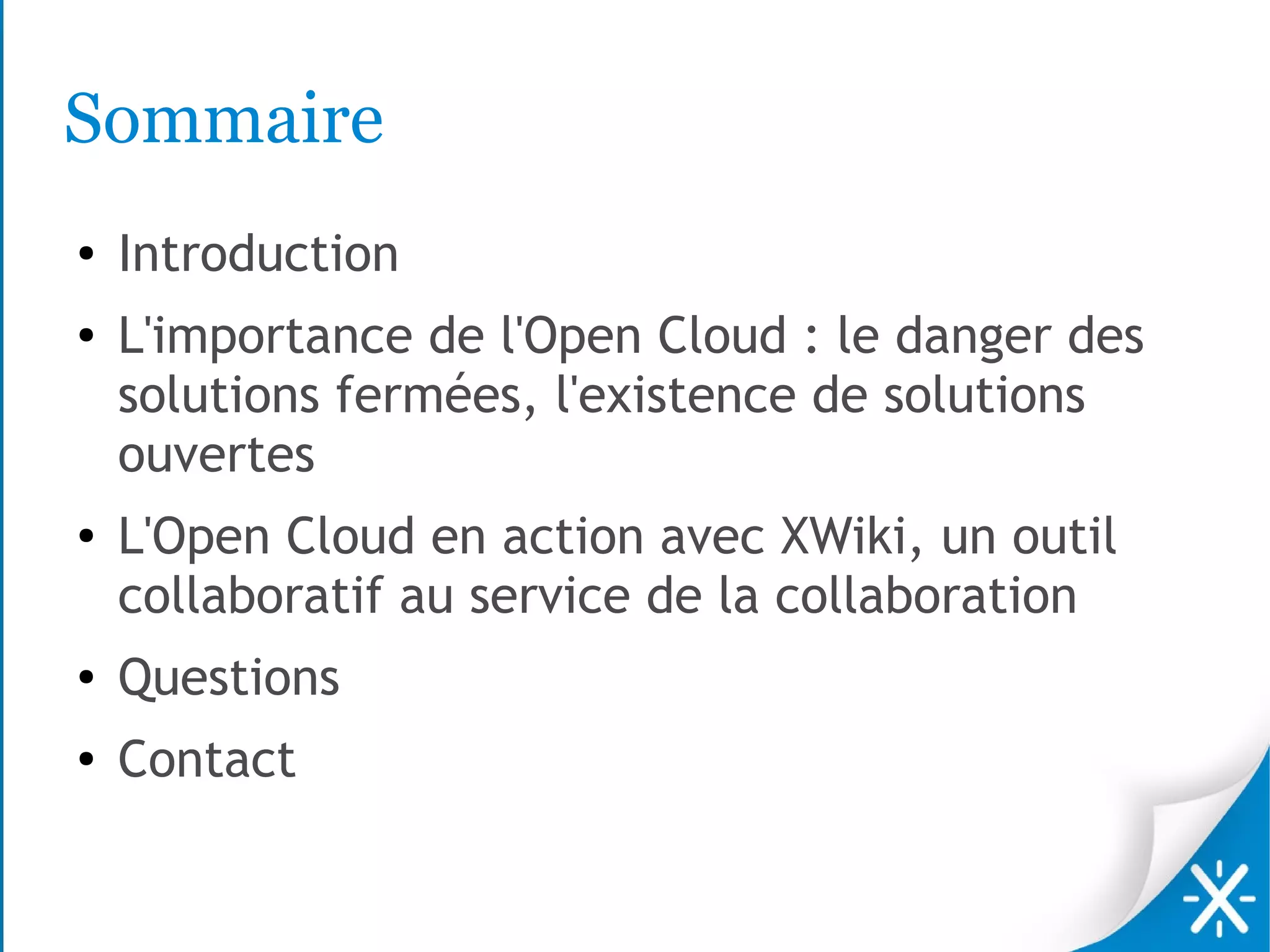 Le document présente l'importance de l'open cloud et son application à travers XWiki, un outil collaboratif open source. Il aborde les avantages, défis et critères de choix pour les solutions cloud, en soulignant que l'open cloud favorise la propriété des données et la flexibilité pour les utilisateurs. XWiki se distingue par sa capacité à organiser l'information et son extensibilité, tout en restant un acteur clé dans l'écosystème open cloud.