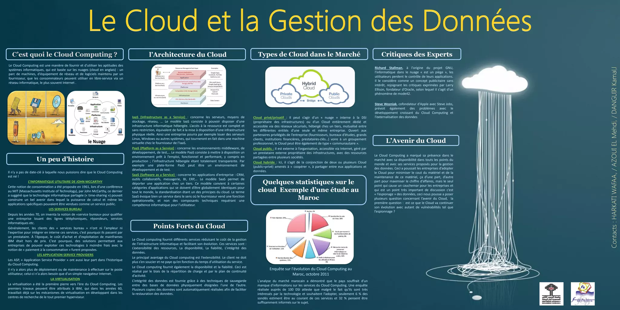 Le document retrace l'évolution historique et les différents types de cloud computing, introduisant des concepts comme le service bureau, le IaaS, le PaaS et le SaaS, tout en soulignant les avantages notamment en termes de coût et d'extensibilité. Il mentionne également des critiques sur la dépendance aux services cloud et les préoccupations concernant la sécurité et l'espionnage des données. Une enquête montre un manque de sensibilisation et d'information sur ces technologies au Maroc, malgré un intérêt marqué des décideurs.