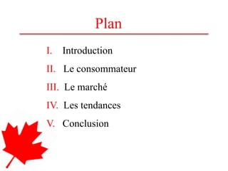 Le document présente l'état du commerce électronique au Canada, soulignant ses atouts comme un taux de pénétration élevé d'Internet et une population de consommateurs en ligne croissante. Cependant, il note également la réticence des détaillants canadiens à adopter le commerce en ligne et un développement globalement en retard. Des tendances telles que l'importance d'un processus d'achat simplifié et des options de livraison variées sont également mises en avant.
