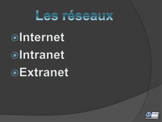 Internet est un réseau mondial interconnecté qui permet l'échange d'informations et le développement d'applications variées. Les intranets et extranets offrent des services internes ou des accès sécurisés pour les partenaires, facilitant ainsi la communication et la collaboration. La topologie du réseau, qu'elle soit en bus, étoile, anneau, arbre ou maillée, définit l'architecture et les connexions entre les dispositifs du réseau.