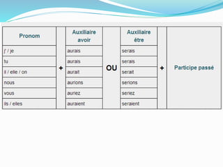 Le document traite de la construction du conditionnel passé en français, qui se forme avec les auxiliaires 'avoir' ou 'être' suivis du participe passé. Il illustre des usages variés tels que le regret, le reproche, l'incertitude, et les phrases hypothétiques. Des exemples concrets montrent comment ces constructions s'appliquent dans différents contextes.