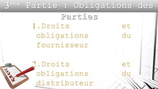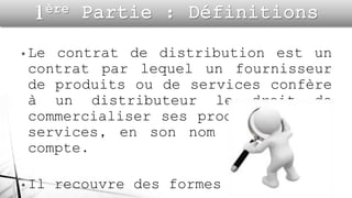Le contrat de distribution est un accord qui permet à un distributeur de commercialiser les produits d'un fournisseur, avec différentes formes telles que la distribution exclusive et la franchise. Il implique des clauses essentielles et des obligations pour les deux parties, offrant des avantages comme l'autonomie pour le distributeur et le soutien logistique pour le fournisseur, mais aussi des inconvénients tels que la dépendance mutuelle. Les modalités d'extinction du contrat incluent la résiliation et les manquements aux obligations contractuelles.