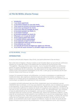 Le document de Charles Finney, 'Le feu du réveil', aborde les problématiques des réveils religieux, en insistant sur leur superficialité croissante et les dangers d'une excitation malsaine. Finney partage ses observations sur l'évolution des réveils, soulignant la nécessité d'une conviction profonde du péché et l'importance d'éviter le fanatisme. Il appelle les chrétiens à une introspection afin de revitaliser la profondeur et l'efficacité des réveils dans les églises.