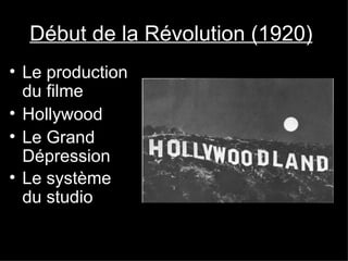 Le document traite de l'évolution du cinéma dans les années 1920, en soulignant l'impact de la révolution cinématographique et la Grande Dépression sur l'industrie hollywoodienne. Il explore les studios majeurs et mineurs, ainsi que les contributions de figures emblématiques comme Chaplin et Murnau, et introduit des innovations telles que le 'split screen'. Enfin, il mentionne la transition vers les 'talkies' et les changements réglementaires de l'époque.