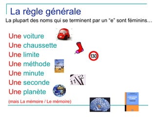 Le document traite des règles de genre des noms en français, spécifiant que la plupart des noms se terminant par 'e' sont féminins, tandis que ceux sans 'e' sont généralement masculins, avec de nombreuses exceptions. Il aborde également les noms qui changent de genre selon leurs emplois et fournit des exemples variés pour illustrer les exceptions aux règles établies. De plus, il mentionne les noms géographiques et certains composés, tout en soulignant des cas particuliers en fonction du nombre et de l'emploi.
