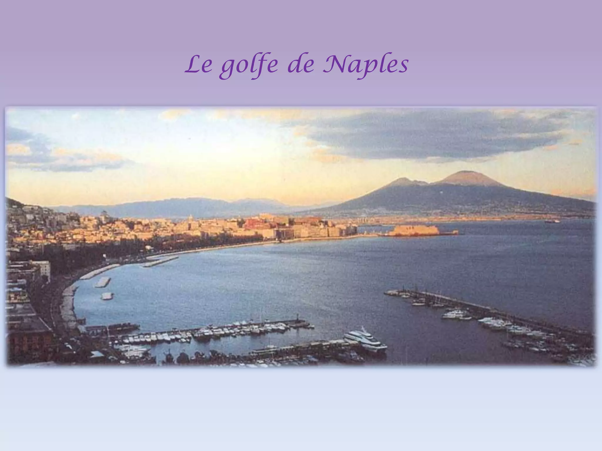 Le golfe de Naples est situé entre la péninsule flegrea et la péninsule de Sorrente, entouré par les champs phlégréens et le Vésuve. Il abrite trois îles importantes : Ischia, célèbre pour ses nombreuses sources, Capri, connue pour ses grottes, et Procida, formée par des éruptions volcaniques. Ce golfe est caractérisé par sa géographie volcanique et ses attraits touristiques.