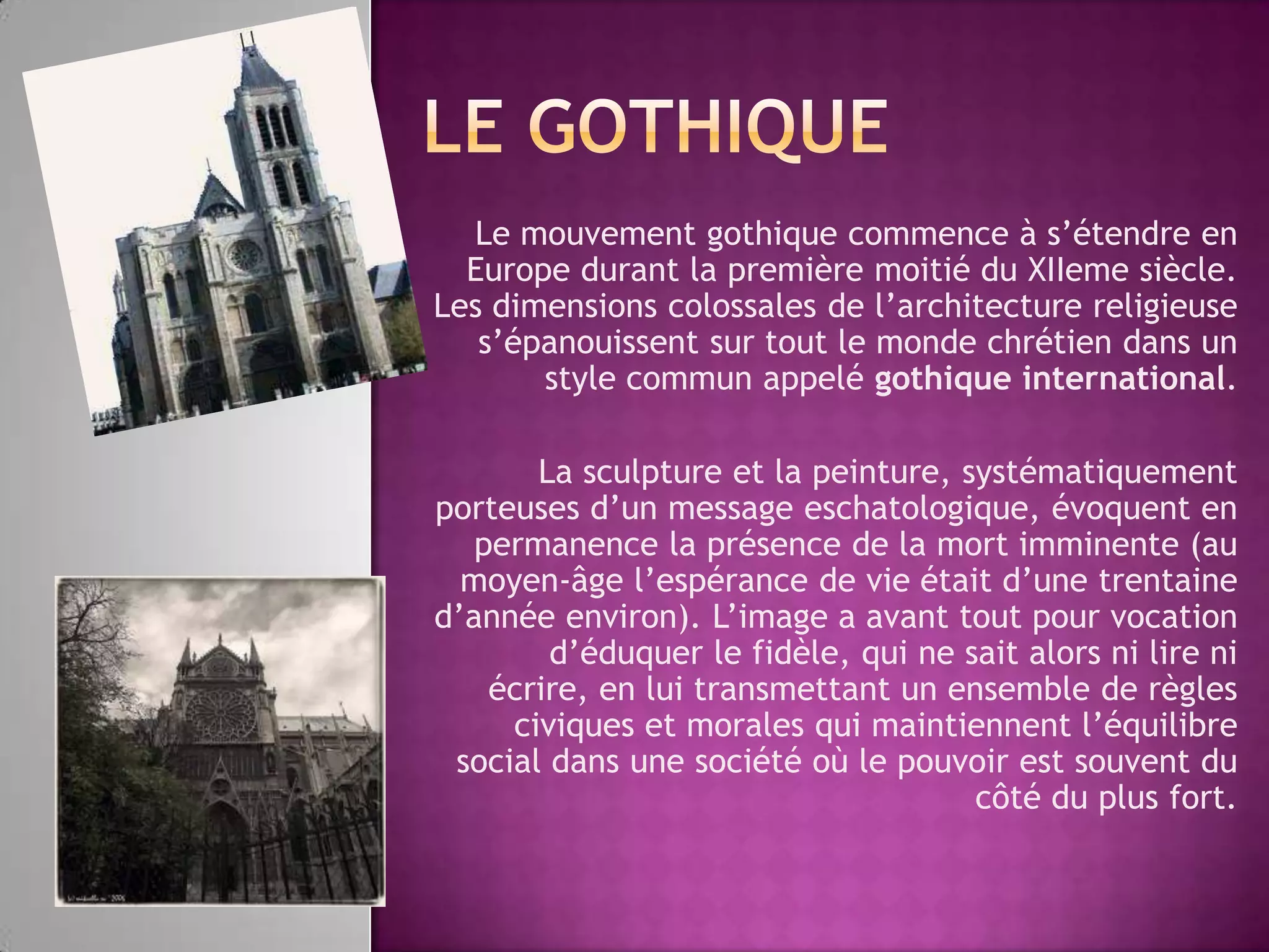 Le mouvement gothique, qui a émergé au XIIe siècle en Europe, est marqué par une architecture colossale et des innovations techniques telles que la voûte sur croisée d'ogives et les arcs-boutants, permettant des édifices plus élevés et lumineux. L'art gothique utilise la couleur et la sculpture pour éduquer les fidèles et symboliser la lumière divine, tandis que des figures comme Giotto commencent à introduire un réalisme dans la peinture. Ce style atteint son apogée avant de céder la place à la Renaissance au XVe siècle, bien que des éléments gothiques persistent jusqu'à la fin du XVIe siècle.