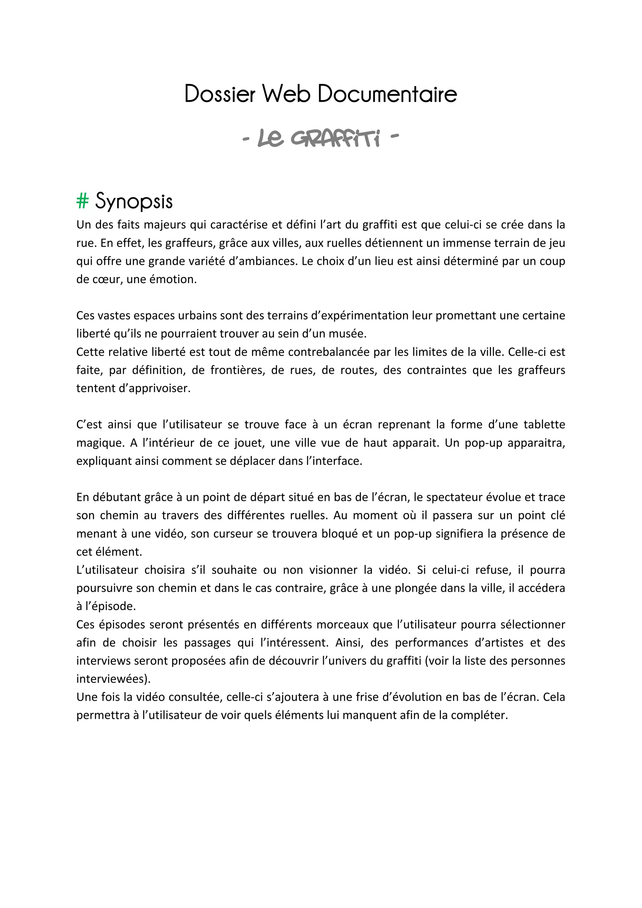 Le document présente un projet de webdocumentaire sur l'art du graffiti, mettant en avant l'importance des espaces urbains comme terrain d'expérimentation pour les graffeurs. Il propose une interface interactive où les utilisateurs peuvent naviguer dans une carte de la ville, visionner des vidéos d'interviews et de performances d'artistes, tout en ajoutant ces éléments à une frise d'évolution. Le projet inclut diverses interviews d'experts et passionnés du graffiti, visant à explorer ses dimensions sociologiques, culturelles et artistiques.