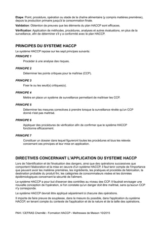 Le document présente les principes et la mise en œuvre du système HACCP, qui est un outil essentiel pour garantir la sécurité alimentaire en identifiant et maîtrisant les dangers à chaque étape de la chaîne alimentaire. Il décrit les sept principes fondamentaux du HACCP, les mesures de contrôle à appliquer, ainsi que l'importance de l'engagement de la direction et du personnel. Enfin, il souligne la nécessité d'un registre précis et d'une formation adéquate pour assurer l'efficacité du système.