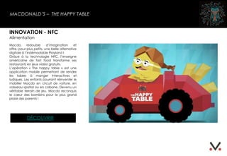 Le document présente diverses innovations marketing, mettant en avant des initiatives créatives d'entreprises comme McDonald's, Molson Canadian, Renault, Groupama, Stiegl et Nike pour interagir avec les consommateurs de manière ludique et engageante. Les conceptions vont de tables interactives pour enfants à des applications mobiles facilitant les déplacements et encourageant des comportements responsables. Chaque innovation met l'accent sur une connexion avec l'identité de la marque et le plaisir des utilisateurs.