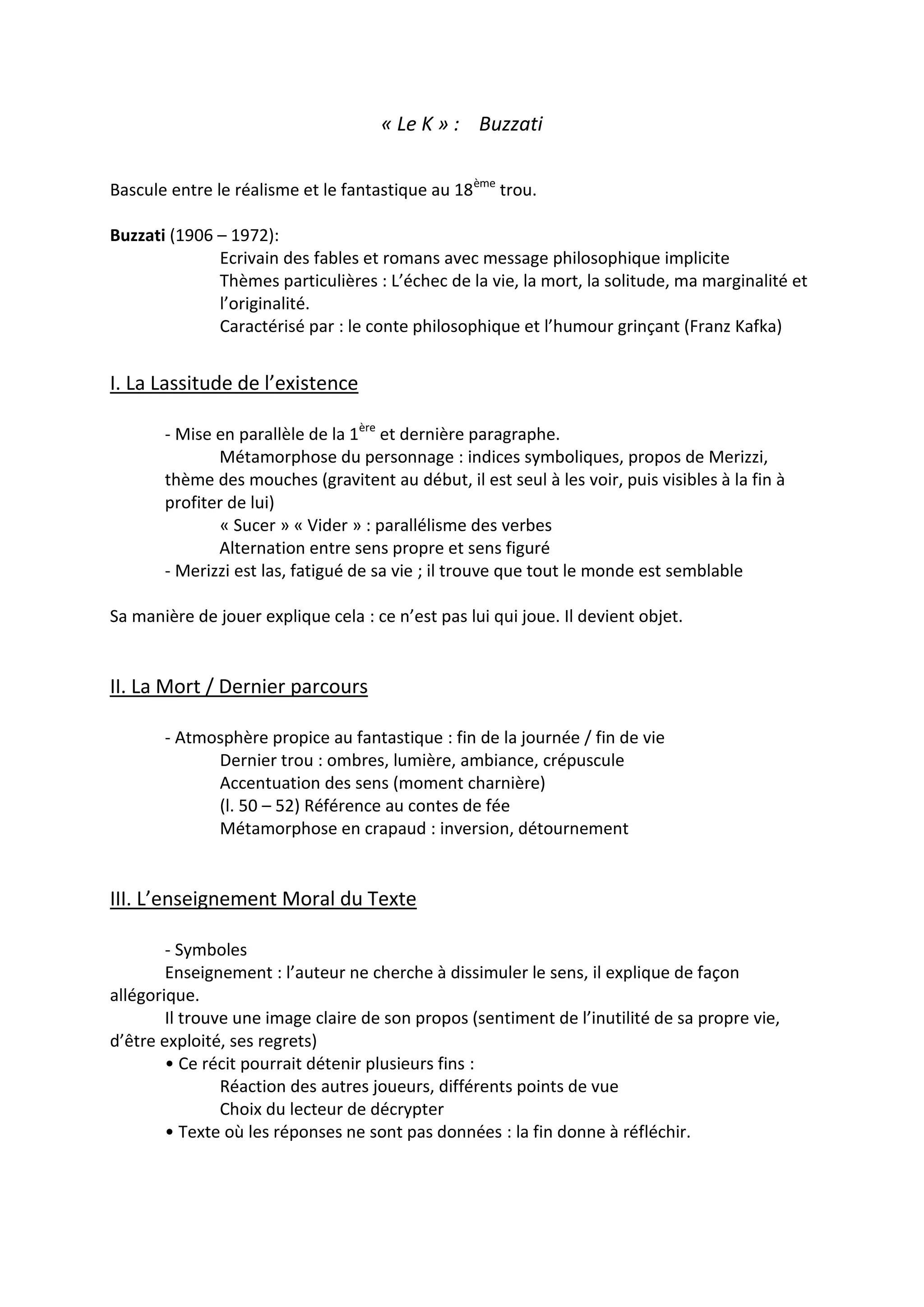 Le texte analyse l'œuvre de Buzzati, qui oscille entre réalisme et fantastique, explorant des thèmes tels que la solitude et l'échec de la vie. À travers la métamorphose du personnage principal et l'atmosphère fantastique, l'auteur propose une réflexion sur l'inutilité et les regrets de l'existence. Le récit invite le lecteur à interpréter ses multiples fins et à envisager différentes perspectives.