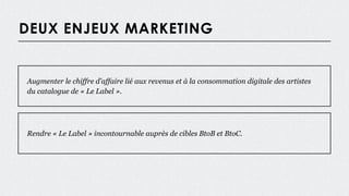 Le document présente des recommandations marketing pour l'agence 'les machines' afin d'augmenter les revenus et la visibilité du label musical. Il souligne les enjeux de la transformation digitale, la nécessité d'une offre hybride et d'une plateforme de découverte musicale immersive, tout en mettant l'accent sur la création d'une communauté engagée autour de la musique. Les recommandations incluent le ciblage des jeunes consommateurs, l'intégration de la gamification et des expériences live pour renforcer l'attractivité du label dans un marché concurrentiel.