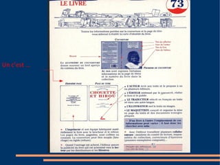 Le document semble décrire une page de couverture d'un roman et inclut une image d'un livre, ainsi que des clés pour s'y repérer. Il se concentre sur le guide d'utilisation du livre. Les images fournies illustrent ces éléments.