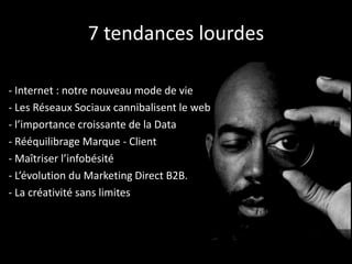 Le document examine les tendances actuelles et futures du marketing direct, mettant en avant l'impact du numérique, des réseaux sociaux et du big data sur les comportements des consommateurs et des entreprises. Il souligne l'évolution vers un marketing direct B2B plus personnalisé et multicanal, ainsi que la nécessité de maîtriser l'infobésité et de s'adapter aux nouvelles générations de consommateurs. Enfin, il aborde les tendances émergentes comme le neuromarketing et les objets communicants qui transforment le paysage commercial.