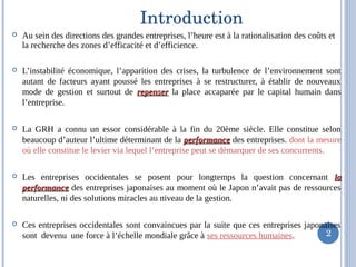 Le document explore le lien entre la gestion des ressources humaines (GRH) et la performance des organisations, soulignant l'importance croissante du capital humain face aux défis économiques contemporains. Il traite de l'évolution de la fonction RH, passant d'une simple administration à un management stratégique essentiel pour le succès organisationnel. Les recherches ont confirmé que des pratiques RH bien formalisées ont un impact significatif sur la performance, faisant de la GRH un levier stratégique pour se démarquer dans un environnement concurrentiel.