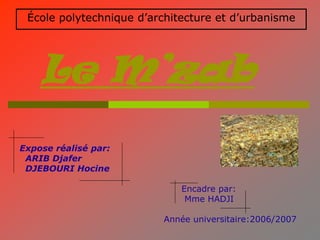Le document présente une étude sur le M'zab, une région en Algérie, soulignant son importance socioculturelle et architecturale. Il décrit l'histoire et la géographie de la vallée, ainsi que les types de maisons qui y sont construits, mettant en avant leur adaptation à l'environnement et aux traditions locales. Enfin, il souligne la richesse patrimoniale de la vallée, reconnue par l'UNESCO comme une source d'inspiration architecturale.