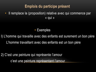 Le document traite du participe présent en français, en expliquant sa formation et ses usages. Il présente des exemples illustrant comment remplacer des propositions relatives par des participes présents, ainsi que des cas d'utilisation pour exprimer la cause et l'antériorité. Enfin, il aborde la formation des formes composées du participe, avec des exemples supplémentaires.