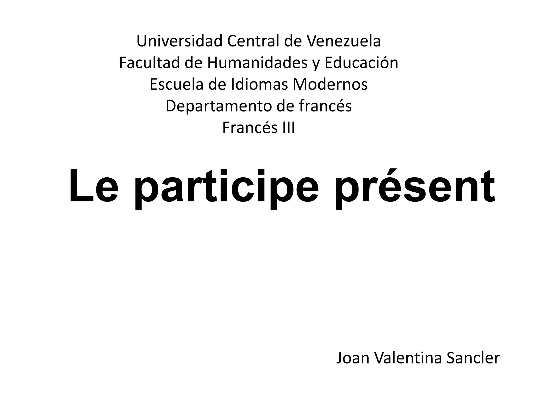 Le document traite du participe présent en français, sa formation, ses valeurs et ses usages. Il explique comment il peut exprimer des subordonnées relatives ou circonstancielles et présente la structure de sa formation tout en notant des exceptions. Des exemples illustratifs sont fournis pour clarifier son utilisation dans différentes contextes.
