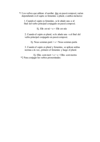 Le passé composé en français se forme avec le sujet, l'auxiliaire être ou avoir conjugué, et le participe passé. Les verbes peuvent avoir des participes passés en -é, -u, ou -i, et l'utilisation de l'auxiliaire dépend du verbe. Les règles d'accord varient également selon le genre et le nombre du sujet.