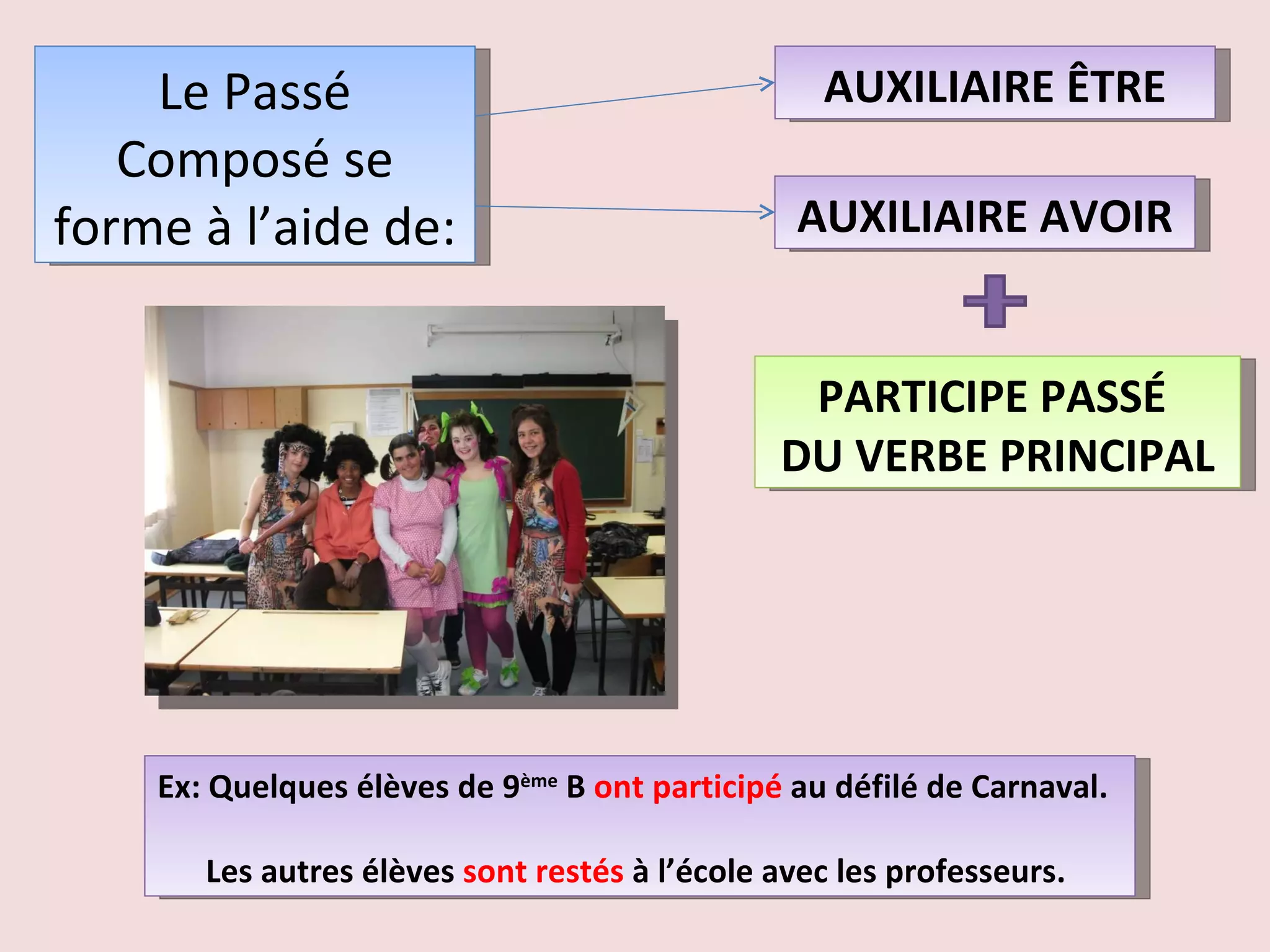 Le document explique la formation du passé composé en français, utilisant les auxiliaires 'être' et 'avoir'. Il précise que 'être' est utilisé pour les verbes pronominaux et que 'avoir' est employé pour la plupart des autres verbes, avec des exceptions. De plus, il aborde les règles d'accord du participe passé en fonction de la présence ou non d'un complément d'objet direct.