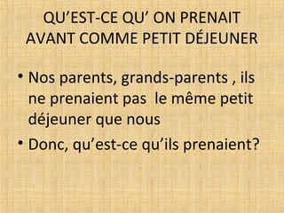 Le document présente l'évolution des habitudes de petit déjeuner des élèves du collège Josep Lluís en Espagne, comparant les choix traditionnels de leurs aînés aux options modernes, souvent influencées par des tendances européennes. En semaine, les élèves préfèrent des repas rapides tandis que le week-end, ils optent pour des plats plus variés et typiques comme les churros. Enfin, il est souligné que le petit déjeuner doit répondre à une portion significative des besoins énergétiques journaliers des adolescents.