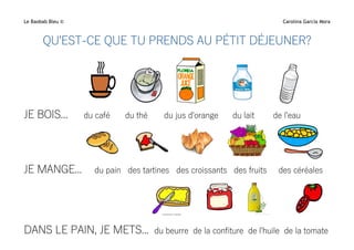 Le document décrit les habitudes de petit déjeuner en mentionnant les boissons et aliments couramment consommés. Il liste des boissons comme le café, le thé et le jus d'orange, ainsi que des aliments tels que le pain, les croissants et les fruits. Le texte évoque également ce que l'on peut ajouter au pain, comme du beurre ou de la confiture.