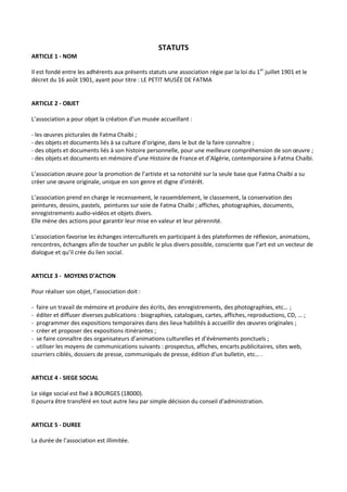L'association 'Le Petit Musée de Fatma' est créée pour promouvoir l'artiste Fatma Chaïbi et son œuvre à travers un musée, en rassemblant des œuvres et documents liés à sa culture et à son histoire. Elle encourage les échanges interculturels et se dote de moyens d'action variés pour mener à bien son objet, tel que la programmation d'expositions et la diffusion de publications. L'association est régie par des statuts qui précisent sa structure, ses ressources, ainsi que les modalités de fonctionnement et de prise de décision.