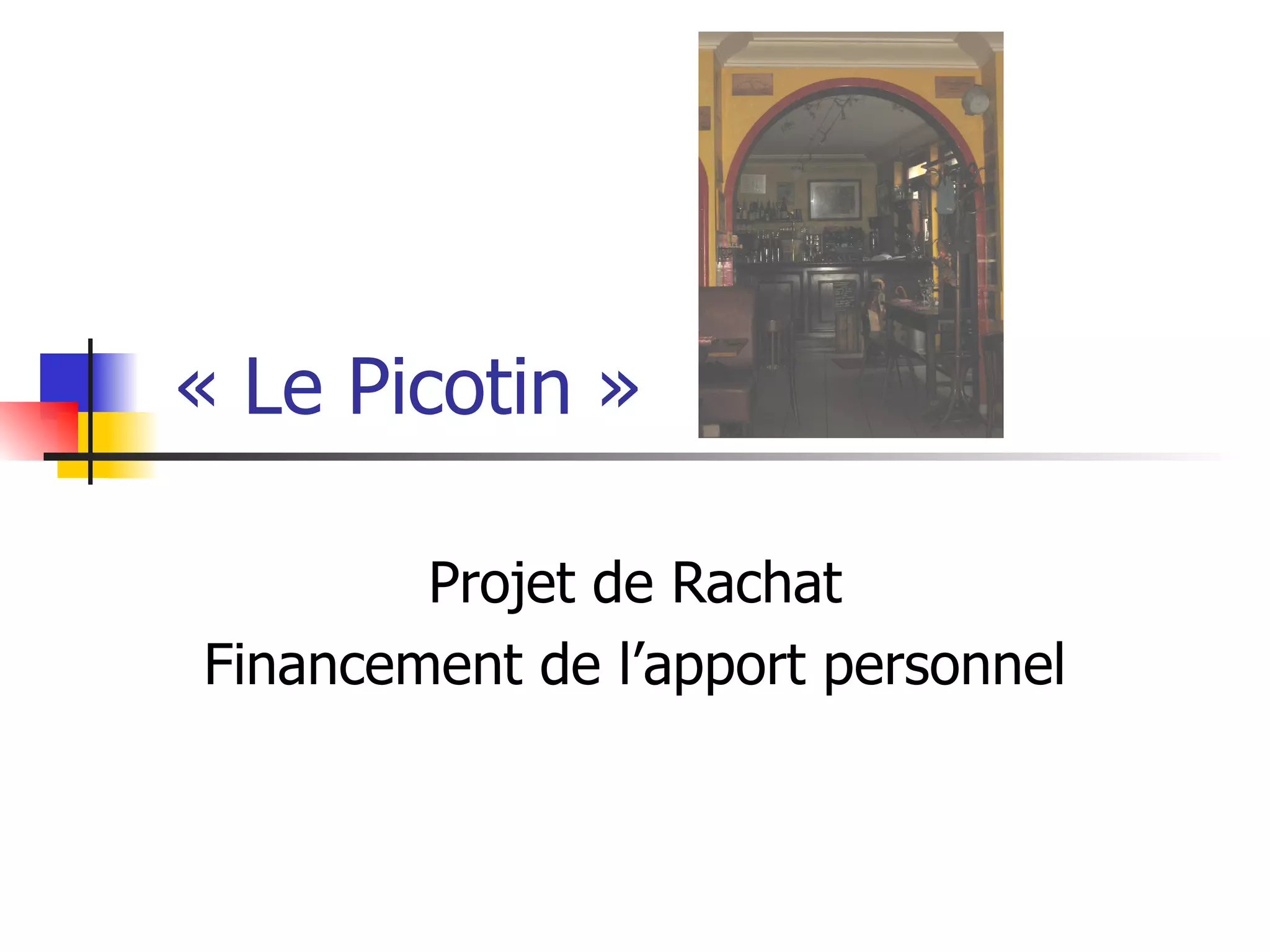 Le projet de rachat du bistrot 'Le Picotin' vise à acquérir le restaurant pour 380 k€, avec un financement bancaire de 330 k€ et un apport personnel de 50 k€. Le bistrot attire une clientèle variée avec 50 à 100 couverts par service et un chiffre d'affaires annuel prévisionnel de 500 k€. Les objectifs incluent l'augmentation de l'exploitation, l'amélioration des équipes de cuisine et l'expansion des périodes d'ouverture.