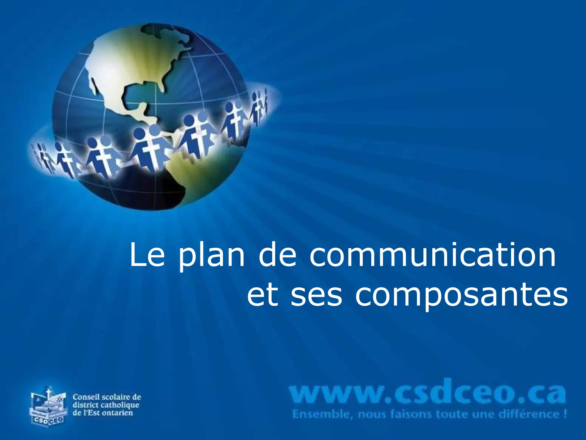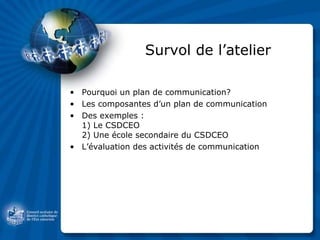 Le document présente un plan de communication essentiel pour les entreprises, soulignant l'importance de connaître la culture, les valeurs et la stratégie de communication avant son application. Il décrit les composantes d'un plan, y compris les objectifs, les cibles, le budget et les méthodes d'évaluation des activités. Des exemples spécifiques de plans de communication du CSDCEO et d'une école secondaire sont également fournis, avec un accent sur l'évaluation continue pour améliorer les résultats.