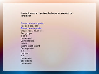 Le présent de l'indicatif décrit des actions ou états se déroulant au moment présent et inclut des règles de conjugaison pour différents groupes de verbes. Les verbes peuvent avoir des particularités orthographiques, notamment en fonction de leur terminaison, et des exemples illustrent ces exceptions. Des verbes usuels tels que faire, pouvoir et aller sont également présentés avec leur conjugaison au présent de l'indicatif.