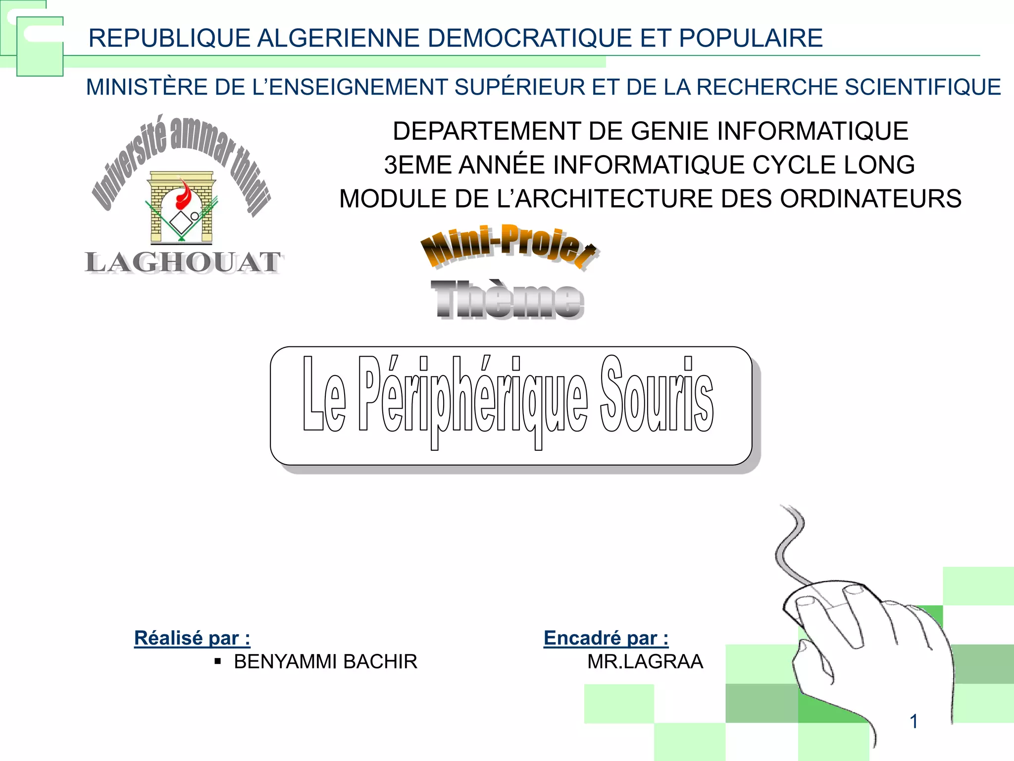 Ce document traite de l'architecture et du fonctionnement des souris informatiques, abordant leur historique, leurs caractéristiques techniques et les différentes technologies de connexion. Il présente également les aspects de programmation associés à l'utilisation d'une souris dans un environnement informatique. Enfin, il souligne l'importance de la souris pour l'interface utilisateur, en la rendant plus accessible et conviviale.