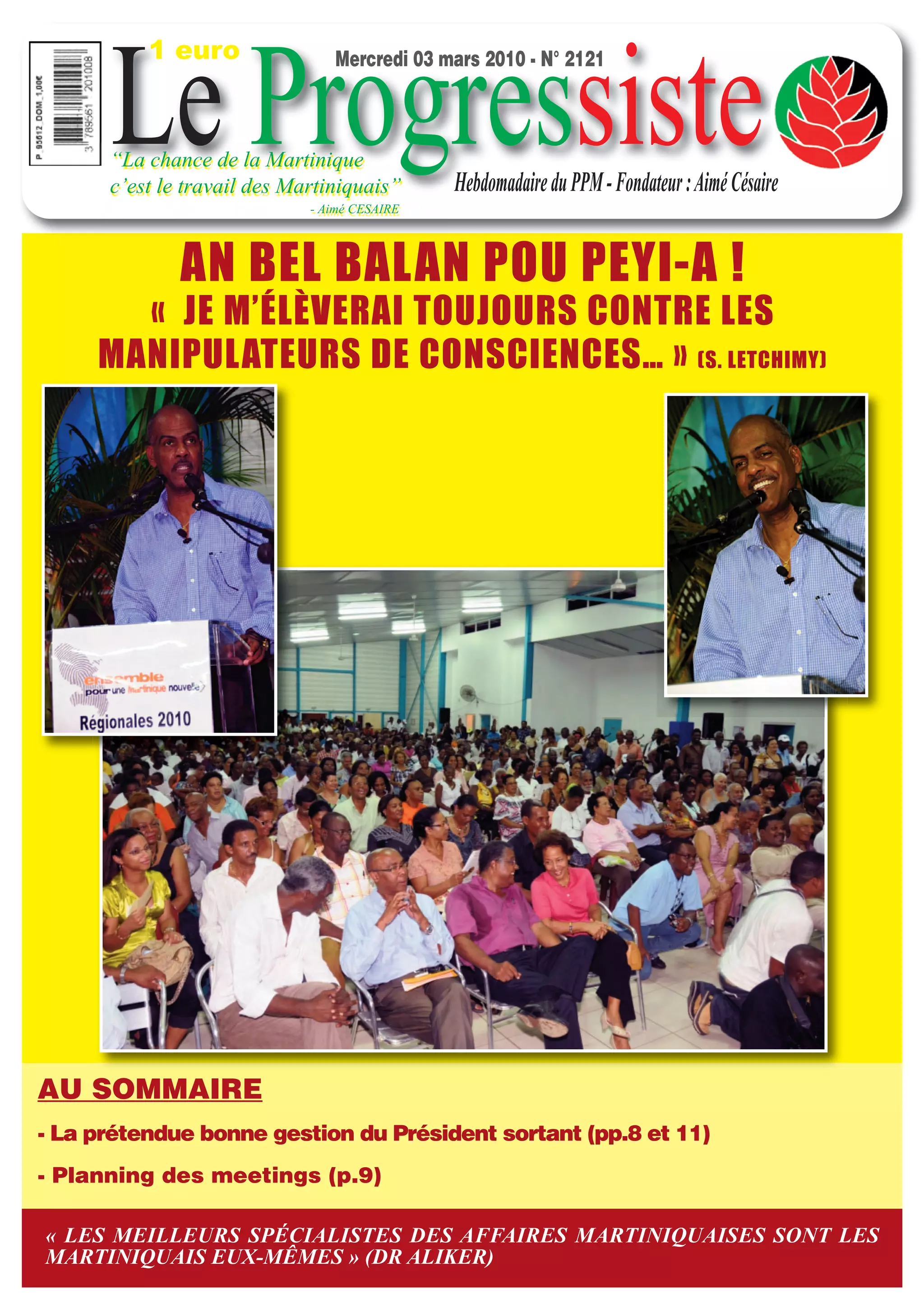 Le document évoque la campagne électorale martiniquaise, dénonçant les attaques ad hominem et appelant à un rassemblement autour de Serge Letchimy pour une 'Martinique nouvelle'. Il souligne l'importance de la prise de conscience du peuple face aux manipulations et à la gestion injuste de l'actuelle administration. Les résultats financiers de la ville de Fort-de-France et de la cacem sont également présentés comme des preuves d'une gestion maîtrisée et saine.