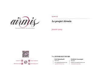 Le projet Airmis, dirigé par Eric Raimbault et Frédéric Lecompte, se concentre sur l'évolution du conseil en IT à travers des phases de stratégie, de communication, et d'appropriation des valeurs. Il met l'accent sur l'importance de la gestion du savoir, de la solidarité, de la créativité, et de l'excellence pour soutenir la croissance et l'employabilité des consultants. La transformation des organisations par le management est envisagée comme essentielle pour naviguer dans un environnement de plus en plus complexe.