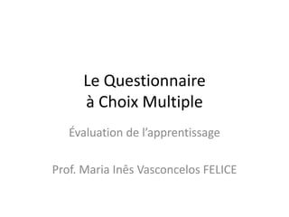 Le document explique le fonctionnement des questionnaires à choix multiple (QCM) en évaluation pédagogique, en détaillant leurs avantages et limites. Il décrit différents types de QCM, tels que ceux à réponses multiples et ceux avec degrés de certitude, ainsi que des conseils pour leur construction, y compris la clarté des questions et l'importance de la préparation des étudiants. L'accent est mis sur la nécessité de concevoir des QCM valides et fiables, évitant les ambiguïtés et les formulations complexes.