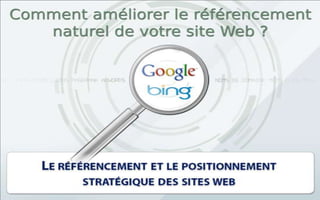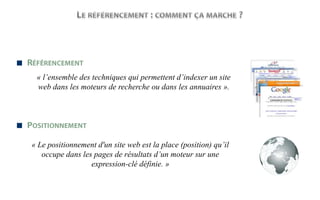 Le référencement regroupe des techniques pour indexer un site web dans les moteurs de recherche et annuaires, distinguant le référencement naturel, axé sur un positionnement à long terme à faible coût, et le référencement payant, qui permet une visibilité immédiate. Les moteurs de recherche fonctionnent par un processus d'indexation basé sur des algorithmes, tandis que les annuaires fournissent simplement des fiches descriptives sans recherche approfondie. Le référencement naturel nécessite du temps et de la valorisation de contenus de qualité, sans garantie de positionnement sur des mots-clés spécifiques.