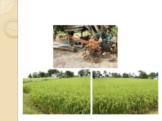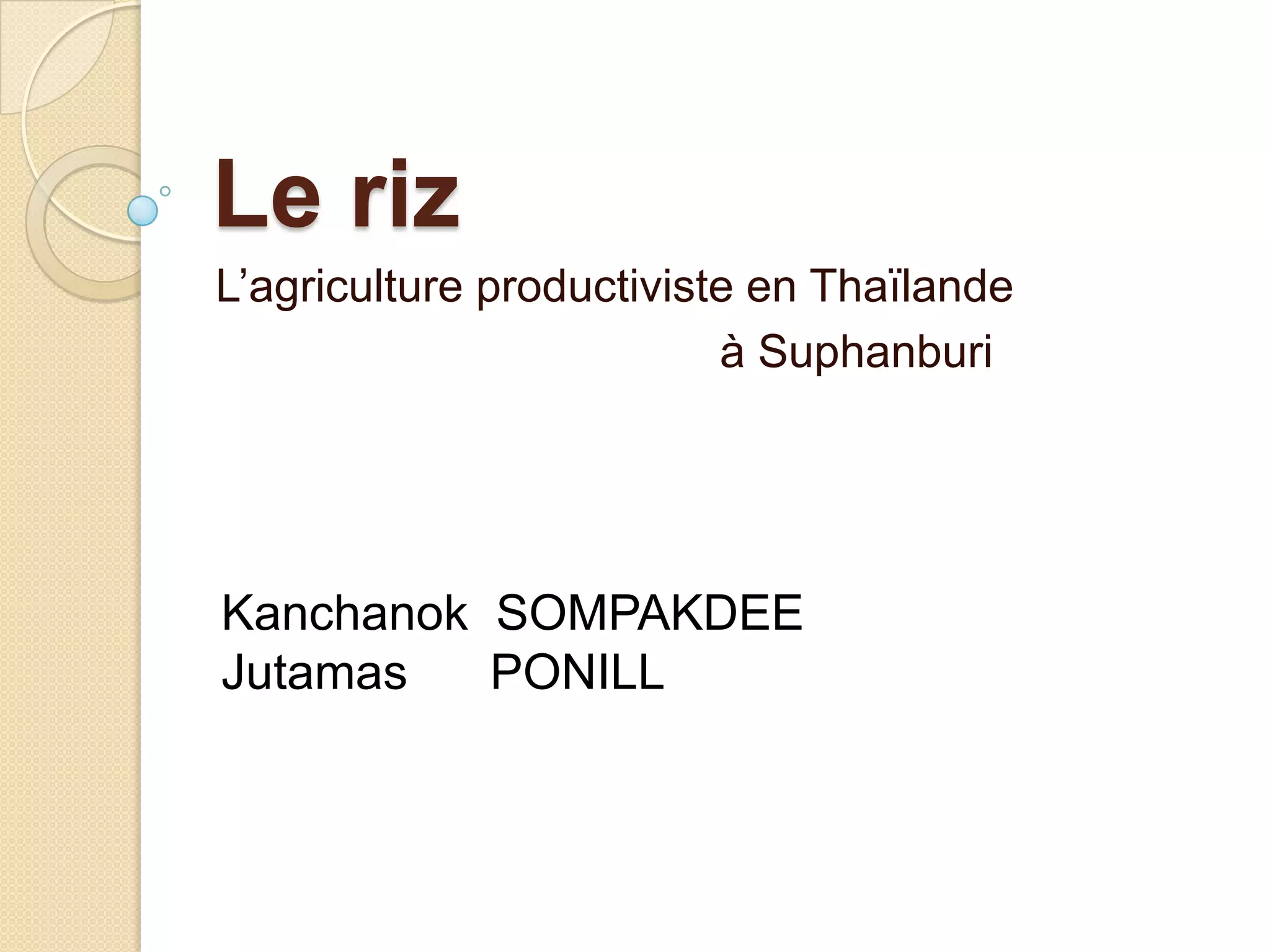 Le document examine l'histoire, la culture et l'agriculture productiviste du riz en Thaïlande, en soulignant son importance en tant que culture de base pour la population. Il décrit les étapes de la culture du riz, les méthodes de récolte et les enjeux économiques, tout en abordant les avantages et inconvénients de la mécanisation et de l'utilisation de produits chimiques. La conclusion souligne que la production de riz en Thaïlande vise à satisfaire la demande tout en révélant les dangers pour l'environnement et la santé associés à ces pratiques agricoles.