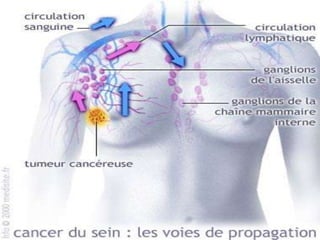 Le document traite de l'anatomie du sein et des différentes interventions chirurgicales pour traiter le cancer du sein, y compris la tumorectomie, la mastectomie partielle et totale. Il aborde également les ganglions lymphatiques, la radiothérapie, la chimiothérapie et l'hormonothérapie, soulignant leur rôle dans le traitement des tumeurs mammaires et les risques associés. Enfin, il explique le processus de formation des métastases et les implications du lymphoedème après chirurgie.