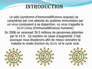 Le VIH (virus d'immunodéficience humaine) cause le sida en attaquant le système immunitaire, particulièrement les lymphocytes T4, entraînant des maladies opportunistes. Le cycle viral du VIH comprend huit étapes, depuis la reconnaissance de la cellule hôte jusqu'à la libération de nouveaux virions et la mort de la cellule cible. La phase asymptomatique peut durer des années, bien que le virus se multiplie et détruit les cellules immunitaires.