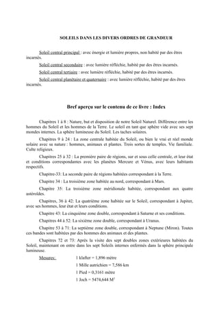 Ce document explore la nature complexe du soleil en tant que corps céleste habité, le décrivant comme une planète parfaite dotée de ses propres zones habitables. Il aborde également les différences entre la vie sur le soleil et sur les autres planètes, ainsi que la manière dont la volonté humaine influence la croissance des plantes. Enfin, il donne un aperçu de la structure interne du soleil et des variétés de vie qui y existent.