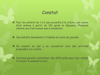 Le document aborde le sommeil des enfants de 1 à 3 ans en crèche, soulignant des difficultés d'endormissement qui entraînent irritabilité et problèmes de concentration. Un projet a été proposé en trois axes : rendre la sieste attrayante, sensibiliser aux bienfaits du sommeil, et identifier les besoins des parents. Le projet inclut des activités telles que la lecture de livres liés à la sieste.