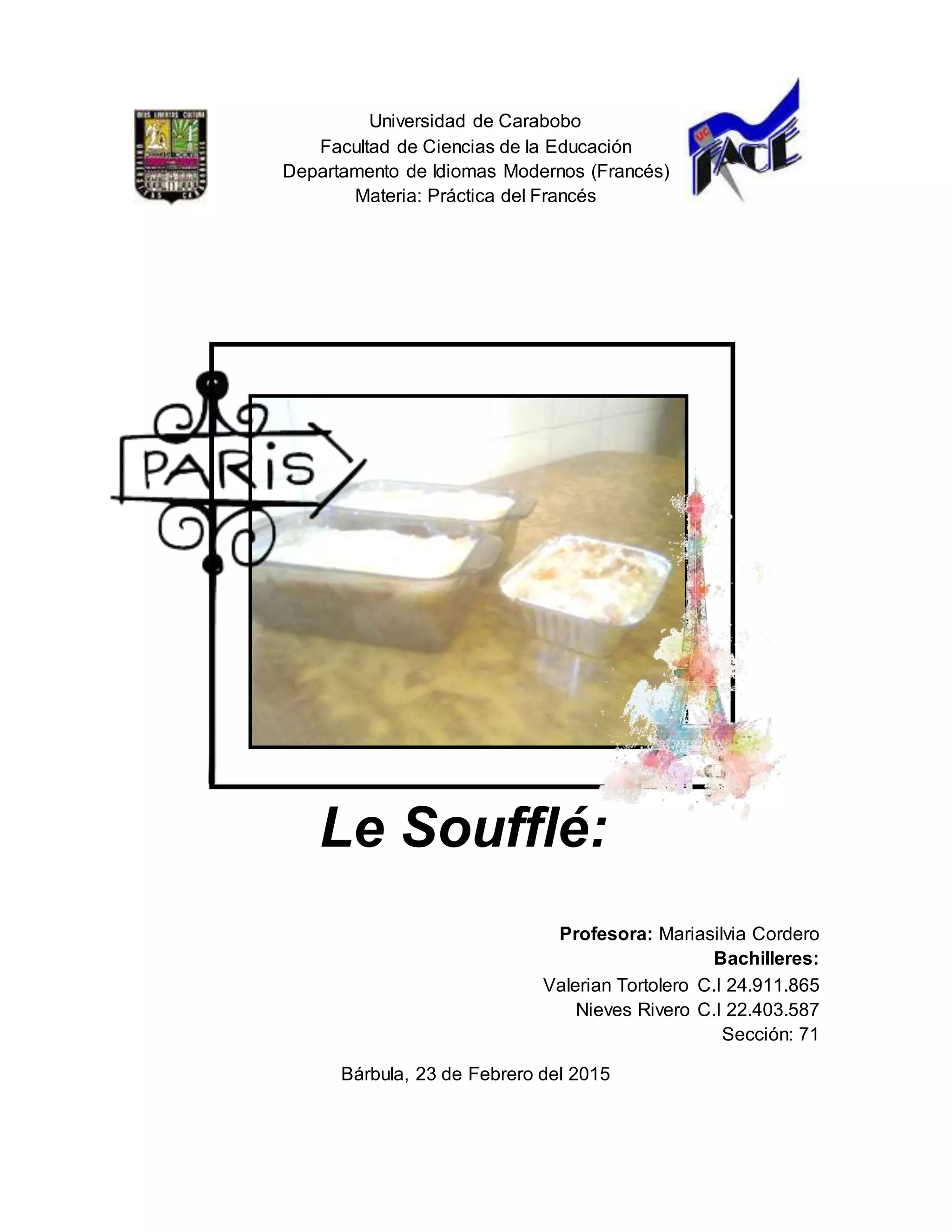 Le document présente une recette de soufflé, incluant les ingrédients nécessaires tels que le chou, les pommes de terre, les oignons et le fromage. La préparation décrit les étapes pour réaliser le soufflé en mélangeant les ingrédients et en les cuisant. Le document est structuré comme un projet scolaire dans le cadre d'un cours de langue française.