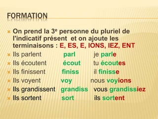 Le document présente la formation du subjonctif en français, en utilisant la 3e personne du pluriel de l'indicatif présent avec des terminaisons spécifiques. Il inclut des exemples de conjugaison pour différents verbes et des cas spéciaux pour des verbes irréguliers. Plusieurs liens sont fournis pour des exercices supplémentaires et des ressources sur le sujet.