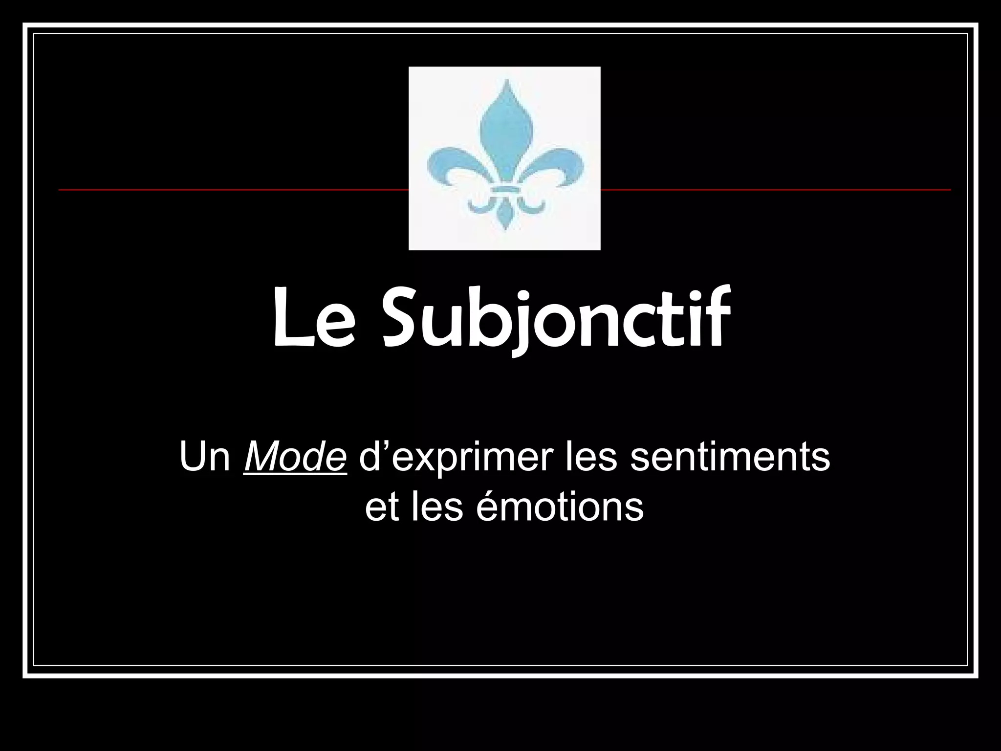 Le subjonctif est un mode de verbe utilisé pour exprimer des sentiments, des émotions et des jugements, par opposition à l'indicatif qui décrit des faits. Sa formation régulière se base sur le radical du présent, tandis que certains verbes irréguliers ont des formes spécifiques au subjonctif. Son emploi se rencontre dans des phrases subordonnées introduites par 'que' après des expressions de volonté, de sentiment ou de nécessité.