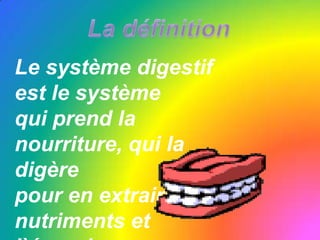 Le système digestif transforme la nourriture en nutriments et en énergie grâce à divers organes comme la bouche, l'œsophage, l'estomac, le foie, et l'intestin grêle. Chaque organe a un rôle spécifique dans le processus de digestion, de la mastication à l'absorption des nutriments. Des faits intéressants incluent la longueur du tube digestif chez un adulte masculin et des détails sur la composition de la salive.
